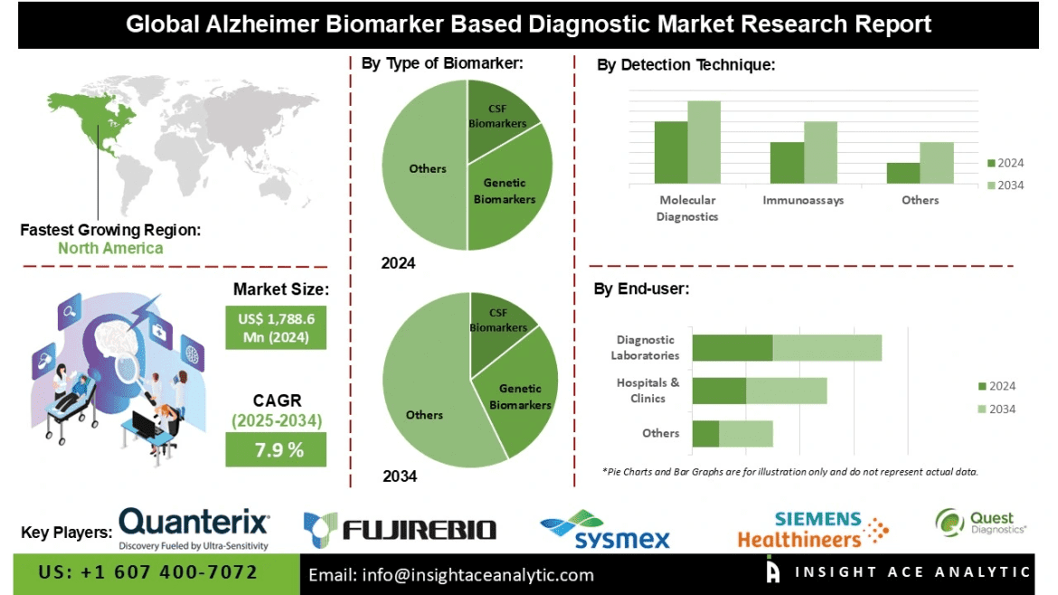 InsightAce Analytic Pvt. Ltd. announces the release of a market assessment report on theGlobal Alzheimer Biomarker Based Diagnostic Market Size, Share & Trends Analysis Report By Type of Biomarker (CSF Biomarkers (Amyloid Beta, Tau Protein, Others), Genetic Biomarkers (Apolipoprotein E, Others), and Blood Biomarkers)), By Detection Technique (Molecular Diagnostics, and Immunoassays), By End-user (Hospitals & Clinics, Diagnostic Laboratories, and Others),-Market Outlook And Industry Analysis 2034″
