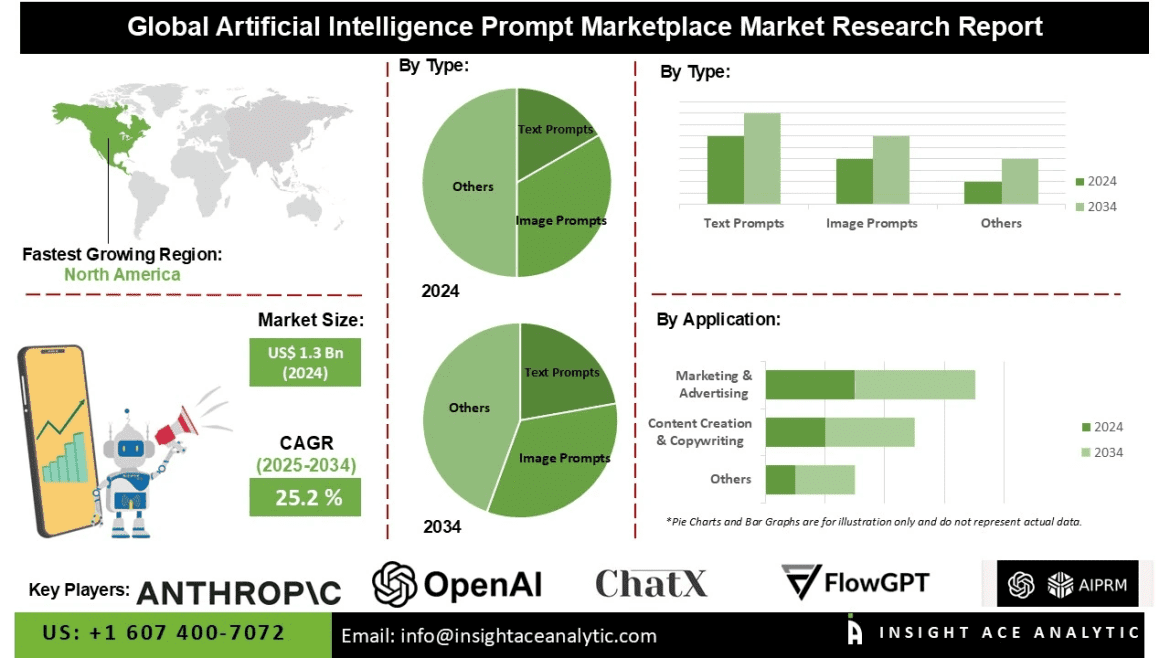InsightAce Analytic Pvt. Ltd. announces the release of a market assessment report on the “Global Artificial Intelligence Prompt Marketplace Market Size, Share & Trends Analysis Report, By Type (Text Prompts, Image Prompts, Audio Prompts, and Video Prompts), By Application (Content Creation & Copywriting, Marketing & Advertising, Education & eLearning, Software Development, Entertainment & Media Production, Graphic & UX Design, Gaming & Virtual Environments, Customer Support & Virtual Assistance, and Others),-Market Outlook And Industry Analysis 2034″