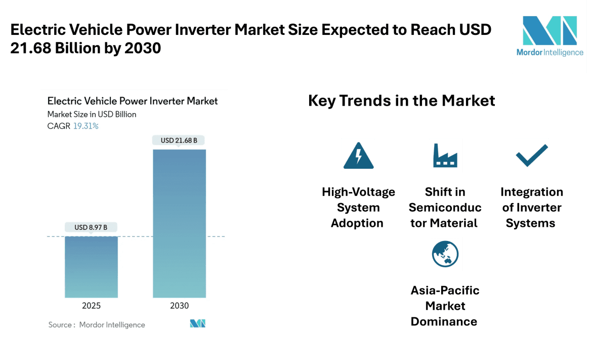The electric vehicle power inverter market size is estimated at USD 8.97 billion in 2025, and is expected to reach USD 21.68 billion by 2030, at a CAGR of 19.31% during the forecast period (2025-2030). This robust growth reflects the increasing deployment of electric and hybrid vehicles worldwide and the growing demand for more efficient power-electronics architectures. The term “electric vehicle power inverter market” refers specifically to the market for inverters that convert direct current from the battery to alternating current to drive the traction motor in electric vehicles, and increasingly for bidirectional functions as well.