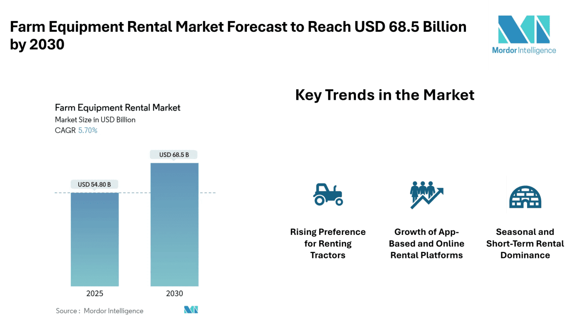 The Farm Equipment Rental market size projected to grow from an estimated USD 54.8 billion in 2025 to approximately USD 68.5 billion by 2030 according to the latest market insights. This growth reflects increased demand for flexible access to tractors, harvesters, and related machinery, supported by digital rental solutions and supportive mechanization programs in key agriculture regions. The forecast period, extending through 2030, highlights sustained demand patterns shaped by evolving farming needs, expanding digital platforms, and diverse regional forces influencing rental adoption