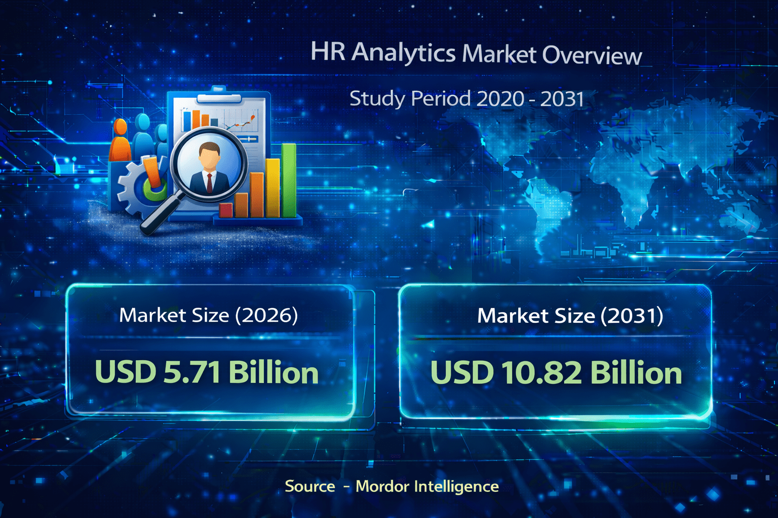 According to Mordor Intelligence, the HR analytics market size stood at USD 5.71 billion in 2026 and is projected to reach USD 10.82 billion by 2031, registering a CAGR of 13.64% during the forecast period. This steady rise in the HR analytics market reflects growing demand for data-backed workforce decisions, stronger compliance needs, and the shift toward predictive and AI-assisted HR management. The HR analytics industry has moved beyond static dashboards and basic reporting. Organizations now use analytics platforms to address attrition, pay equity, workforce planning, and skills mapping. The transition from descriptive to predictive models has become central to HR analytics market growth, especially as companies seek measurable returns from talent investments.