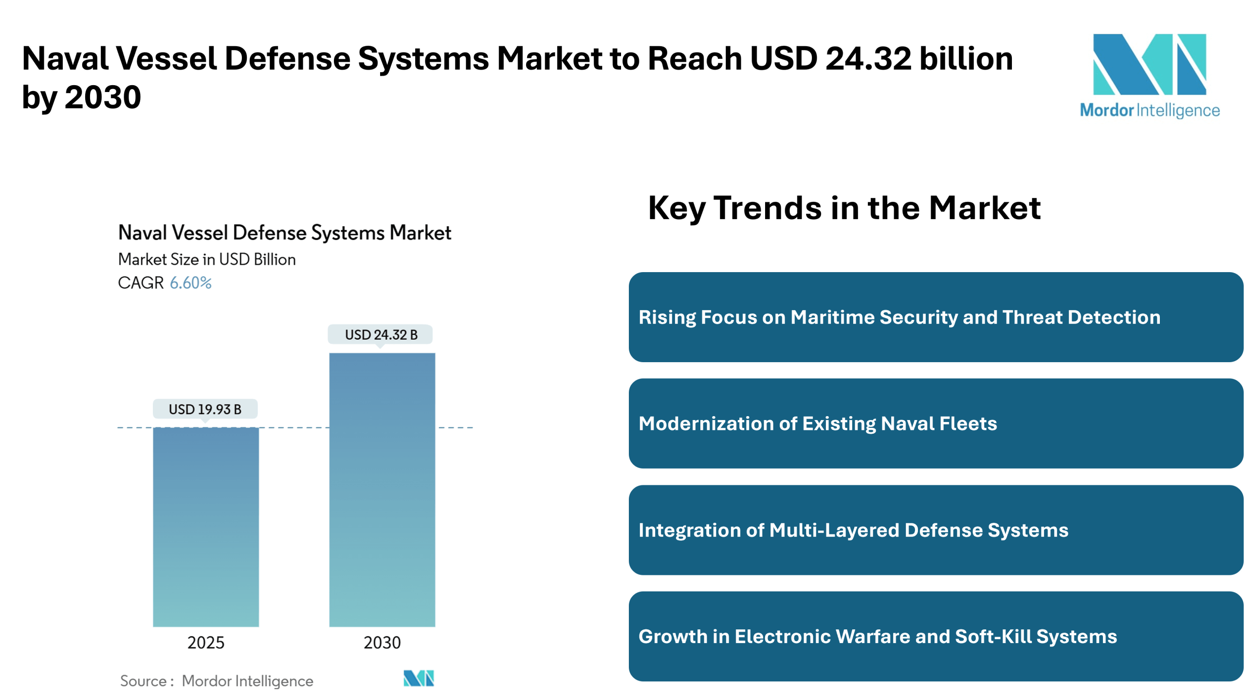 The Naval Vessel Defense Systems Market is projected to grow from an estimated USD 19.93 billion in 2025 to USD 24.32 billion by 2030, registering a CAGR of 6.60% over the forecast period from 2025 to 2030.