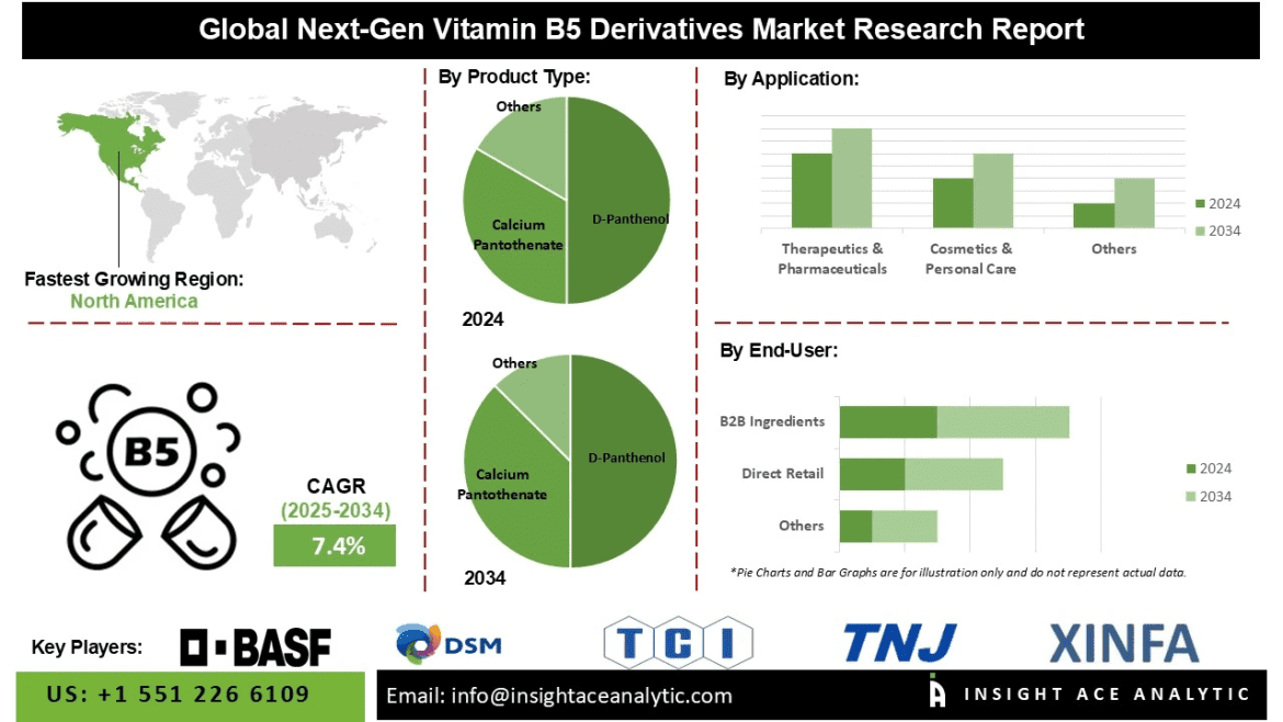 InsightAce Analytic Pvt. Ltd. announces the release of a market assessment report on the “Next-Gen Vitamin B5 Derivatives Market”- By Product Type (D-Panthenol (Provitamin B5), Calcium Pantothenate, Sodium Pantothenate, Coenzyme A Derivatives, Pantethine, Novel Ester Forms), By Application (Therapeutics & Pharmaceuticals, Cosmetics & Personal Care, Nutrition & Animal Feed, Industrial & Nanotechnology, Others Emerging Applications), By Technology (Traditional Chemical Synthesis, Enzymatic Processes, Microbial Fermentation, Nano-encapsulation), By Distribution Channel (B2B Ingredients, Direct Retail, E-commerce), and Global Forecasts, 2025-2034 And Segment Revenue and Forecast To 2034.”