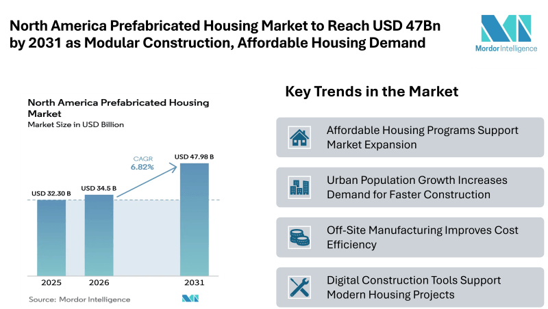 According to Mordor Intelligence, the North America Prefabricated Housing Market Size was valued at USD 32.3 billion in 2025 and is estimated to increase from USD 34.5 billion in 2026 to reach USD 47.98 billion by 2031, registering a CAGR of 6.82% during the forecast period (2026-2031). The market is witnessing steady development as construction companies, housing agencies, and developers look for faster building solutions to address the region’s housing shortage.