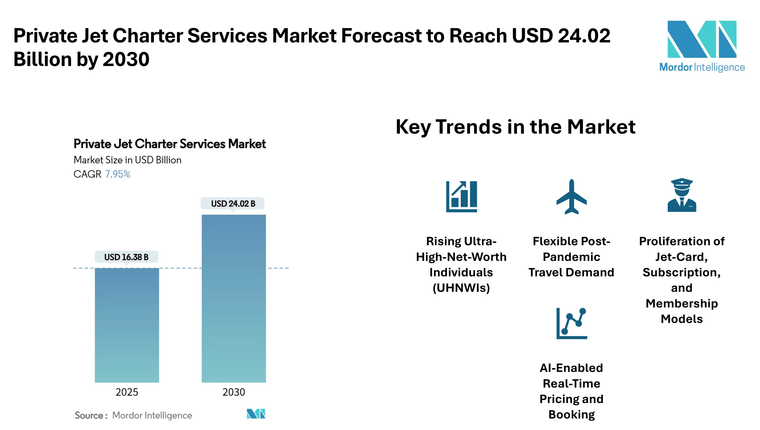 According to a recent analysis by Mordor Intelligence, the private jet charter services market reached USD 16.38 billion in 2025 and is forecasted to reach USD 24.02 billion by 2030, securing a 7.95% CAGR that signals durable expansion across global business and leisure travel. This forecast underscores sustained demand across both corporate and leisure travel segments, driven by increasing ultra-high-net-worth individuals (UHNWIs), flexible travel preferences, and advanced digital platforms.