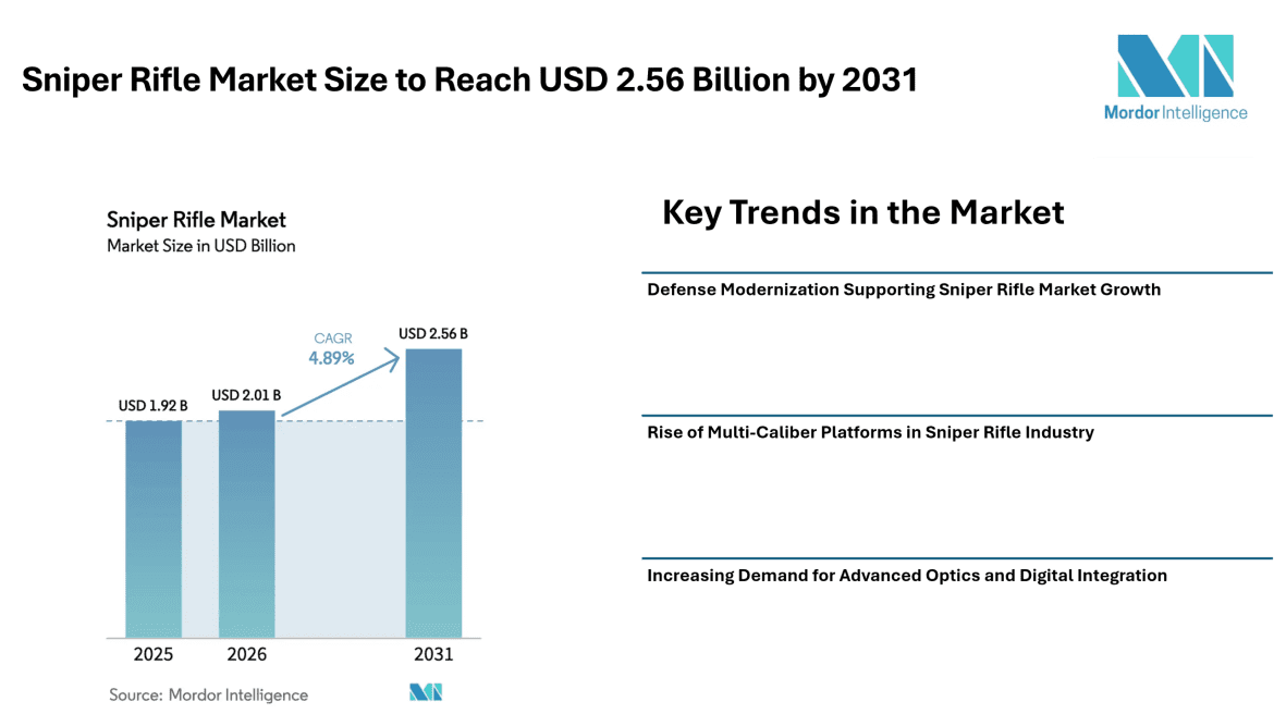 According to Mordor Intelligence, the sniper rifle market size is estimated at USD 2.01 billion in 2026, increasing from USD 1.92 billion in 2025, and is projected to reach USD 2.56 billion by 2031, reflecting a CAGR of 4.89% during the forecast period.